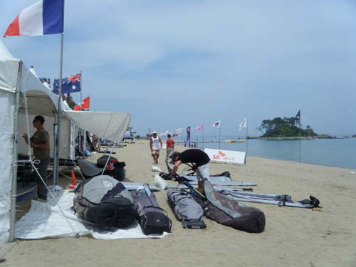 PWA韓国の第1日目は午後1時半にスキッパーズミーティングが行われましたが、ブローでたまにプレーニングはするものの風が足りないまま、ウェイティングで第1日目が終わろうとしています。