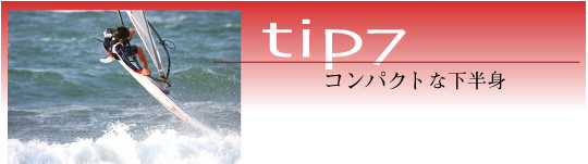 後半は既にセイルパワーがほとんどなくなっているので、後ろ足のヒザを曲げて体をボードに近づけ、下半身をコンパクトにし、出来るだけ回転の妨げにならないようにすることが重要だ。
